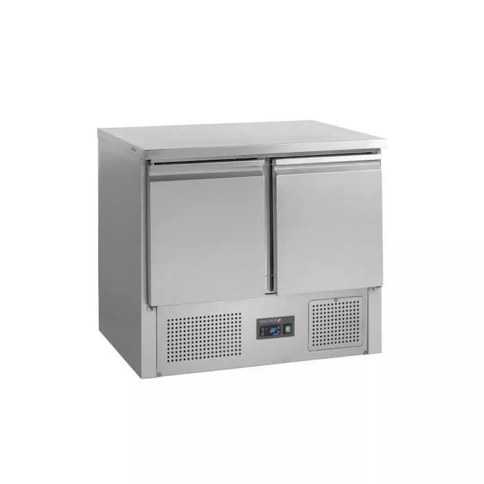 Masă frigorifică profesională tip saladetă, cu 2 uși GN 1/1, realizată din inox, concepută pentru utilizare în restaurante, pizzerii, fast-food-uri sau alte unități HoReCa. Echipamentul oferă o suprafață practică de lucru și spațiu refrigerat pentru depozitarea ingredientelor, fiind ideal pentru prepararea rapidă a salatelor, sandwich-urilor sau altor preparate reci.
