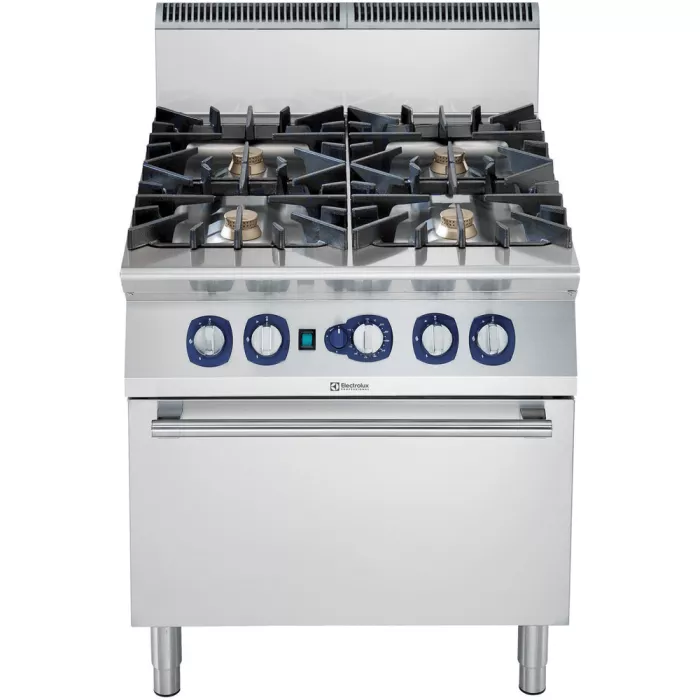 Masina de gatit cu 4 arzatoare (6 kW fiecare), alimentare gaz, si cuptor alimentare pe gaz cu convectie (10,5 kW). Arzatoare Flower Flame extrem de eficiente, cu reglare continua a puterii si combustie optimizata. Dispozitiv de detectare a stingerii flacarii disponibil in varianta standard a arzatoarelor pentru a oferi protectie impotriva stingerii accidentale. Camera cuptor cu 2 niveluri de ghidaje pentru rafturi 2/1 GN (2 vase cu abur).