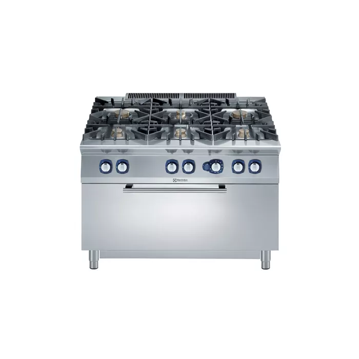 Masina de gatit cu 6 arzatoare (2x10 kW, 4x6 kW), alimentare gaz, si cuptor mare cu alimentare pe gaz (12 kW). Arzatoare Flower Flame extrem de eficiente, cu reglare continua a puterii si combustie optimizata. Dispozitiv de detectare a stingerii flacarii disponibil in varianta standard a arzatoarelor pentru a oferi protectie impotriva stingerii accidentale.