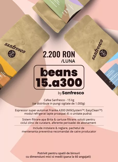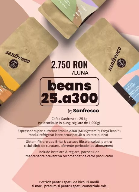 Abonamentul Sanfresco include solutia completa pentru orice spatiu de birou: stocul necesar lunar de cafea, masina super-automata de cafea Franke, filtrul profesional Brita, agenti originali de curatare si clatire, precum si pachetul de mentenanta preventiva pentru functionarea echipamentului in parametri optimi.