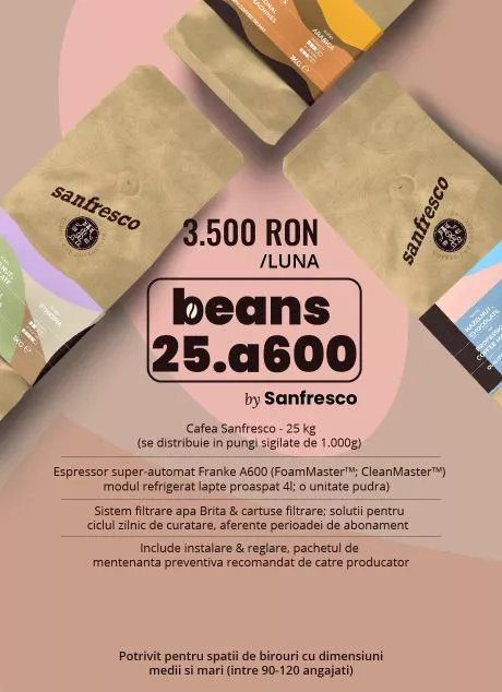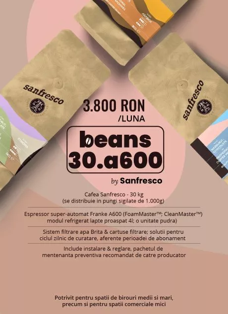 Abonamentul Sanfresco include solutia completa pentru orice spatiu de birou: stocul necesar lunar de cafea, masina super-automata de cafea Franke, filtrul profesional Brita, agenti originali de curatare si clatire, precum si pachetul de mentenanta preventiva pentru functionarea echipamentului in parametri optimi.