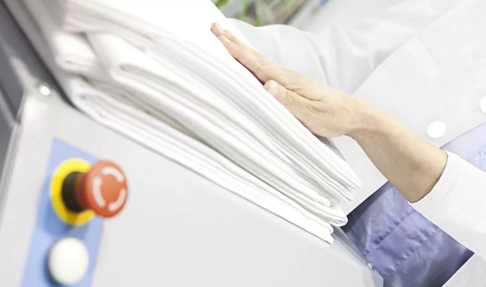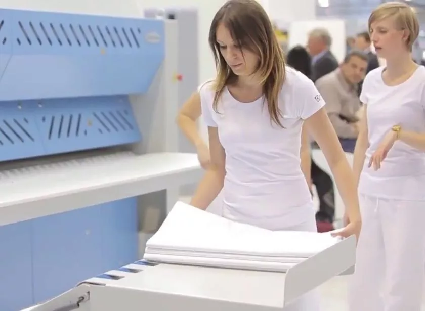 Este suficient un singur operator. Acum se poate opri manual banda de alimentare, pentru a pozitiona lenjeria de pat cu noul buton "stand-by", la ambele capete ale calandrului.